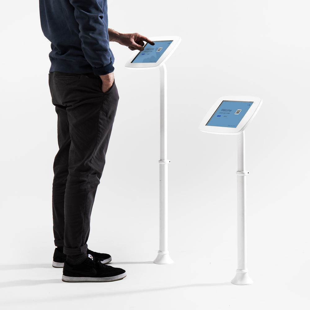 The Bouncepad Original Elevate Slim is a height-adjustable (from 78cm to 117cm to the center of the screen) tablet floor mount with a more compact footprint, making it ideal for retail, hospitality, and event spaces where space is limited. Set the height during installation for standing or seated interactions. It can also be assembled in either portrait or landscape orientation, depending on your content needs.