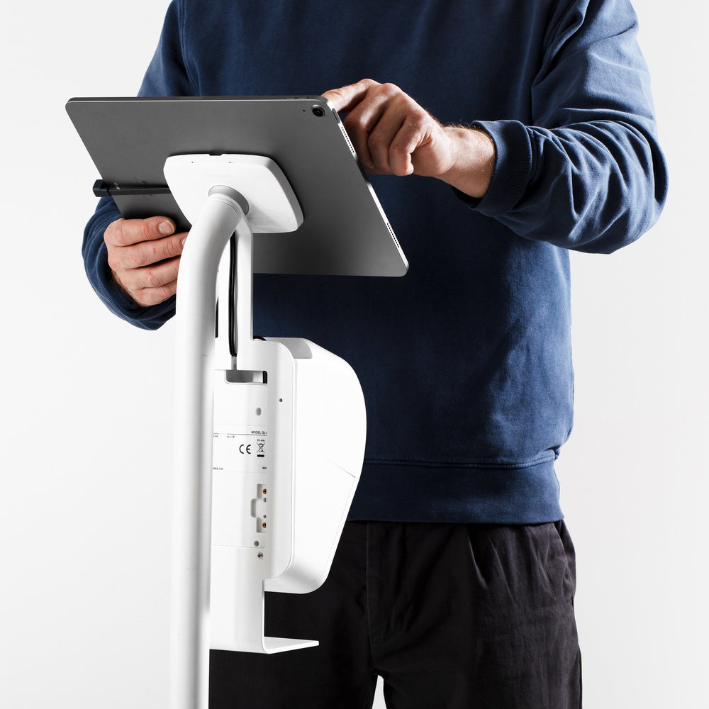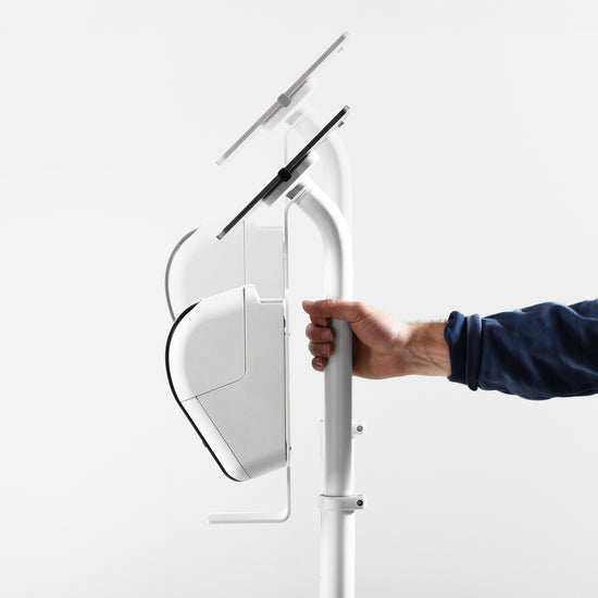 A stylish, height-adjustable floor stand designed for self-service kiosks. The secure printer integration makes it ideal for ticketing, check-ins, and click-and-collect stations. Compatible with any USB-C tablet, including Apple, Microsoft, and Samsung models.