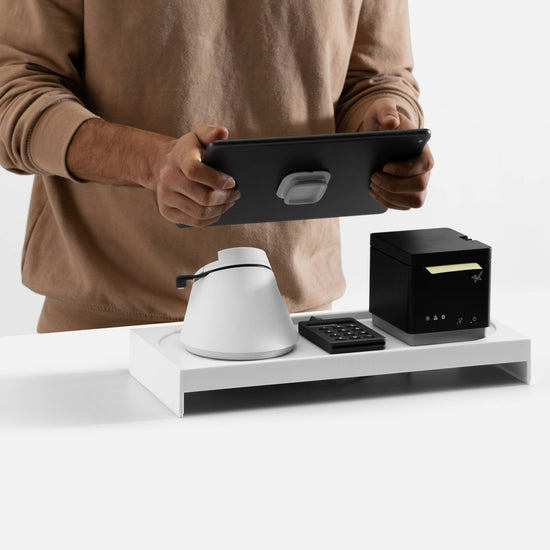Caddy is Click's little helper, managing peripheral devices like card readers and receipt printers, keeping their power cables tidy and concealed. It’s the perfect Tablet and iPad stand setup for retail and hospitality.