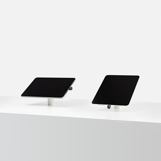 Bouncepad Desk - A secure tablet & iPad desk mount in white.Bouncepad Desk - A secure tablet & iPad desk mount in black.