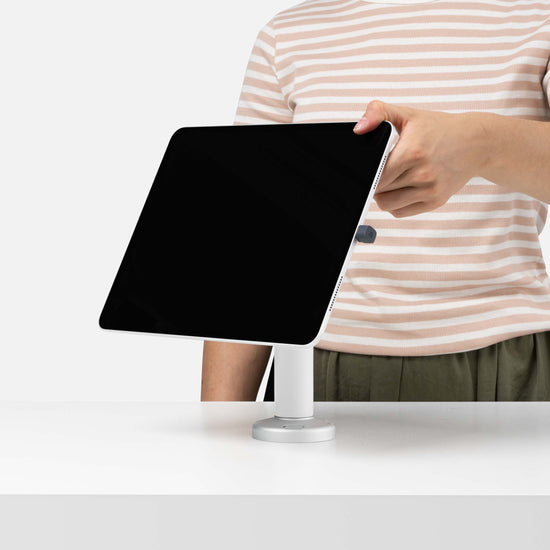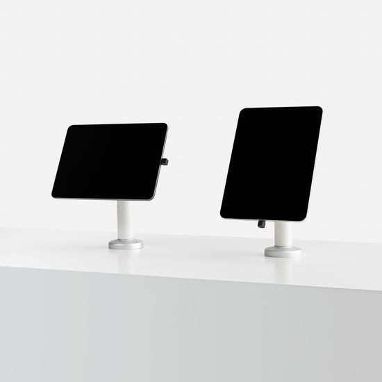 The Bouncepad Core Swivel 60 is a secure, rotating tablet and iPad mount ergonomically designed for easy interaction when mounted to a counter, table or desk. This tablet kiosk lies low on your surface and rotates for easy screen sharing.